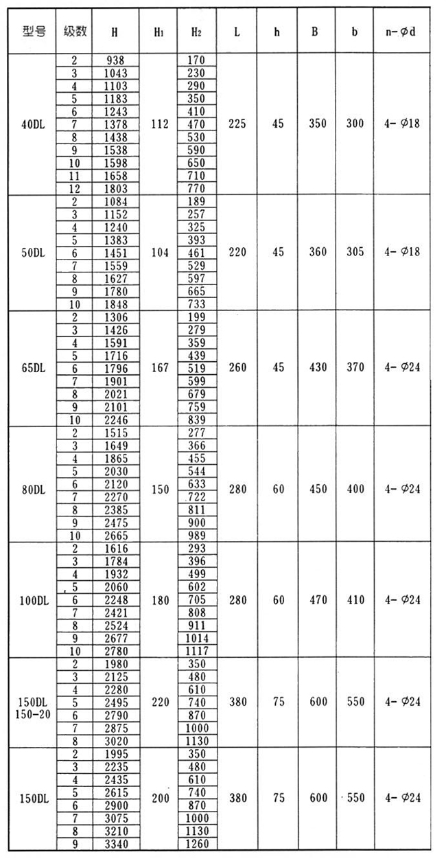 DL立式多級離心泵是采用國家推薦使用的高效節能產品IS型泵的水力模型,為立式多級多節段式結構。螺桿把進水段、中段、出水段夾緊聯成一體。水泵每一級裝一個葉輪、一個導水葉。軸向力采用水力平衡法解決,殘余軸向力由球軸軸承承受,用油脂潤滑。軸封采用軟填料或機械密封。產品執行JB/T2727-93《立式多級離心泵型式與基本參數》標準,主要供吸送稀釋的、清潔的、不腐蝕的、不爆炸的清水及物理化學性質類似水的不含固體顆粒或纖維的液體。