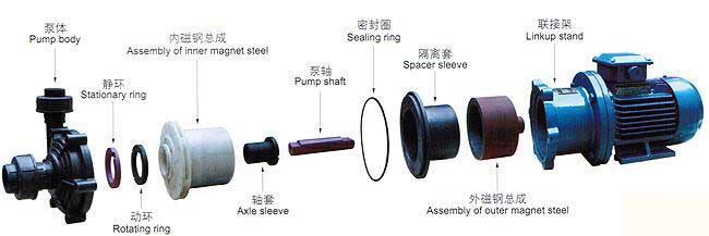 磁力泵以靜密封取代動密封,使泵的過流部件處于完全密封狀態,徹底解決了其它泵的機械密封無法避免的跑,冒,滴之蔽病,磁力泵選用耐腐蝕,鋼玉陶磁,增強聚丙稀作為制造材料,因此它具有良好的抗腐蝕性能,并可以使實輸送介質免受污染。